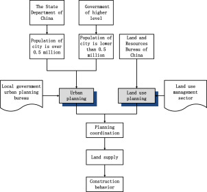 Two types of planning have a potential effect on the construction of cities: urban planning and land use planning. Urban planning, is laid down by the urban planning bureau of a particular city. If the population of a city is over 0.5 million, the urban planning, which is supervised by the local government, needs to be approved by the State Department of China (Figure 1 ). If the city population is less than 0.5 million, the plan needs to be approved by the government at a higher level. The land use planning of the city is laid down by the land use management sector of the local government and needs approval by the Land and Resources Bureau of China. Compared with land use planning, the city urban planning has the force of law while the other has not.