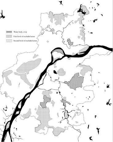 Figure 5.. Prohibited and restricted construction areas in land use planning of Nanjing in 2006 (2006–2020) (Author׳s illustration). |