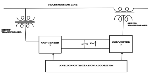 One of the FACTS components, the unified power flow controller (UPFC), is connected in both a shunt and series form. Two back-to-back converters are included in the UPFC, converters 1 and 2, which are connected by a typical dc coupling provided by a dc storage capacitor. According to this theory, actual power can flow between the ac terminals of the two converters in any direction, and each converter can independently generate or absorb reactive power at its own ac output terminal. When a voltage sag or swell occurs in the transmission line, UPFC absorbs or generates reactive power to help maintain a constant output voltage. Converters 1 and 2 are coupled to the transmission line in series and shunt, respectively. ANTLION optimization algorithm is used to determine the optimal size and position of UPFC. The proposed block diagram of UPFC is shown below Figure 1.