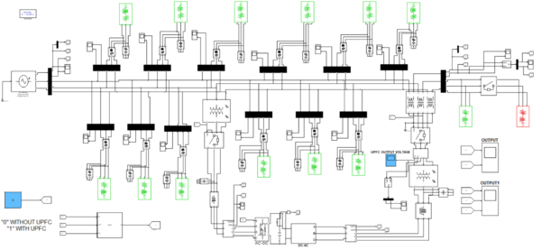 In this work, the IEEE-14 bus test system is designed and analyzed using MATLAB & Simulink models shown in Figure 3 represent the proposed system. The system is connected along with UPFC and an additional switch is provided to know the characteristics of the system without IPFC and with IPFC. To turn on IPFC, 1 is given to run the system with IPFC and 0 is given, IPFC is in off state and run the system without IPFC. One generating bus is given and thirteen load buses are designed in this simulation.