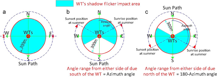 WT׳s shadow flicker impact area at sun path chart of countries: (a) near the equator; (b) north of the equator; (c) south of the equator. Source: the authors after (Giovanello and Kaplan, 2008  ;  Stankovic et al ., 2009 ).
