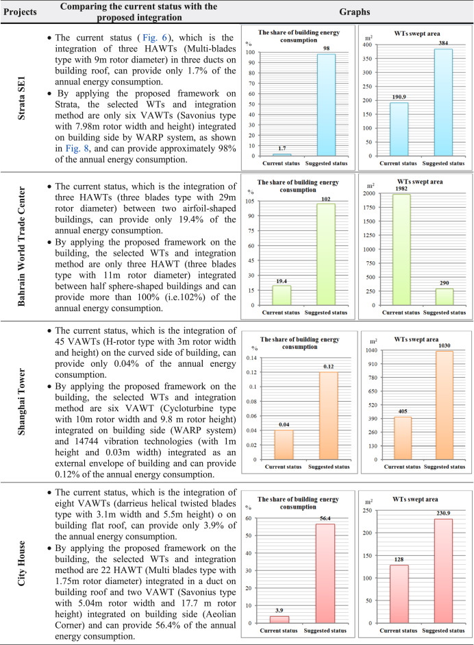 From the results of comparison between current status and proposed integration of the case study buildings, the suggested framework can be effective in determining the site suitability for exploiting WTs, the suitable integration methods and WTs. Therefore, this framework can be a useful tool for architects to design BIWTs.