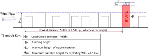• Available height for HAWTs : The minimum suitable height for HAWTs can be determined by avoiding the disturbed regions, which are created by the surrounding obstacles. Therefore, the minimum suitable height for HAWTs should be higher than two-times the surrounding obstacles׳ height, particularly that within one km upwind; and 500 m downwind for the prevailing or exploited wind directions ( Mcguire, 2003  ;  Syngellakis and Traylor, 2007 ). In this context, by comparing the minimum suitable height for HAWTs with building dimensions and constructions permitted height, some integration methods cannot exploit HAWTs. For example, if constructions permitted height in the site equals or lowers than the minimum suitable height for HAWTs; all integration methods cannot exploit HAWTs.