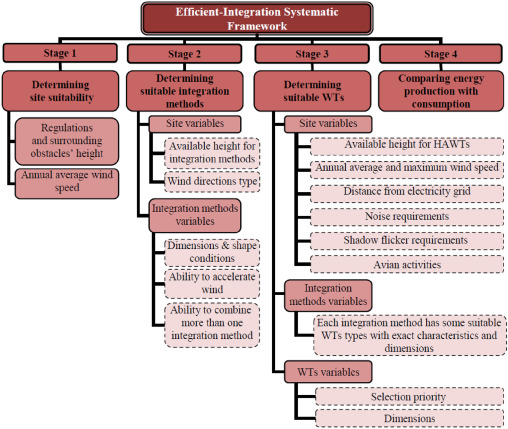 Based upon our empirical work and conceptual analysis as well as related research (for example Dutton et al., 2005 ; Lysen, 1983 ; Masters, 2004 ; Mertens, 2006 ; Stankovic et al., 2009 ; Tong, 2010 ), we define four stages (Fig. 3 ) that need to be followed when designing BIWT. These four stages form a comprehensive systematic framework, which not only serves to unify and define many charts, matrices, equations and other scientific data to architects, but also serves as a platform for the efficient integration of WTs into buildings. In this context, the four stages are illustrated in the following points.