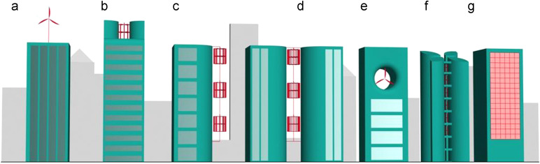 The main methods of WTs integration into buildings: (a) on building roof; (b) concentrator on building roof; (c) on building side; (d) between twin buildings; (e) concentrator within a building façade; (f) combined concentrator within a building façade; and (g) as an external envelop of building. Source: the authors after (Dunster, 2006  ;  Stankovic et al ., 2009 ).