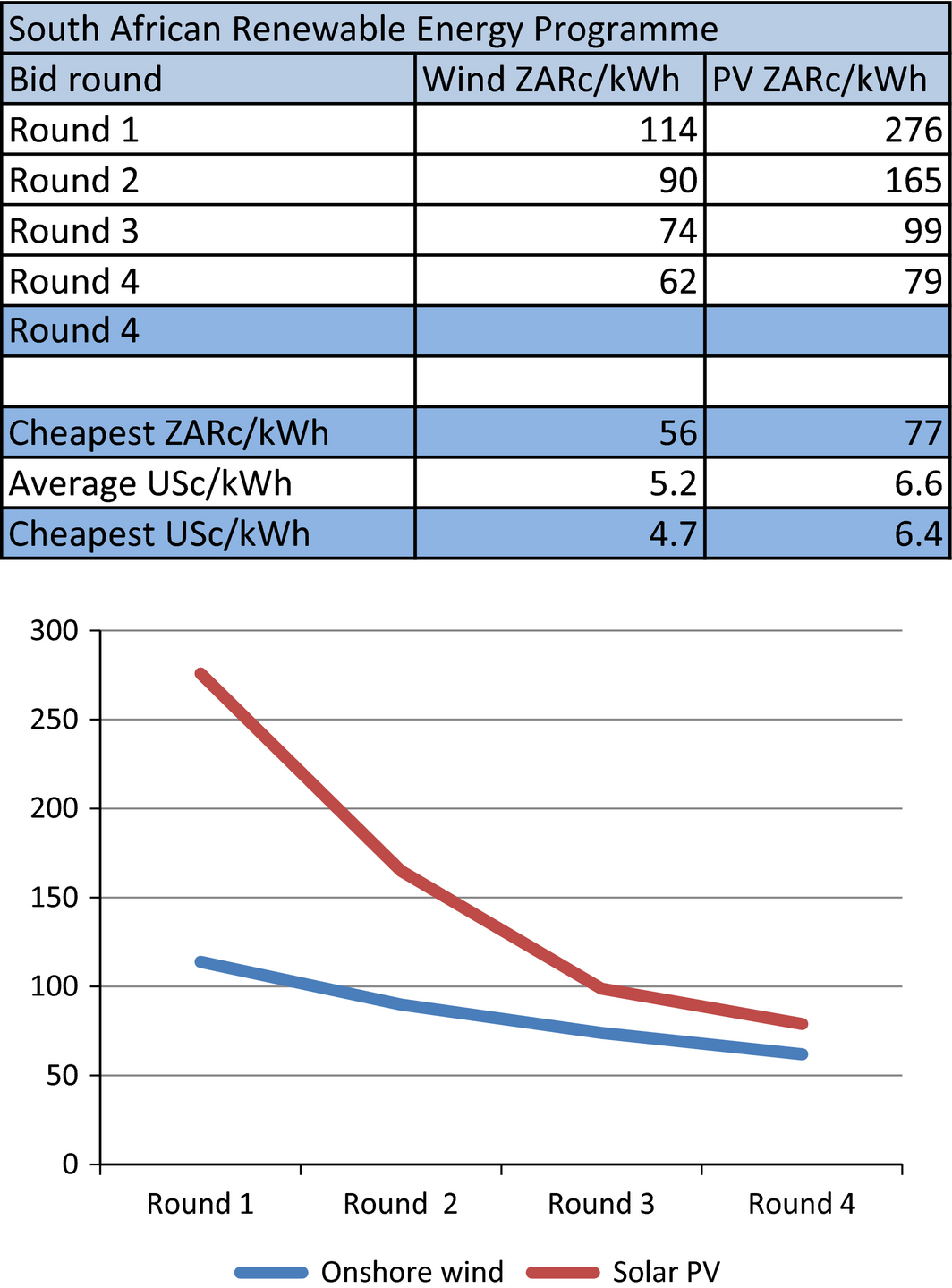 Figure 1. Average nominal bid prices in South Africas renewable energy IPP program (ZARc/kWh). Source: Authors’ compilation based on data provided by South Africas DOE IPP Office. |