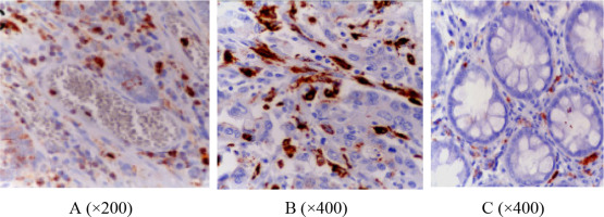 Four-micrometer thick serial sections of formalin fixed, paraffin-embedded tissue were cut and mounted on positively charged glass slides. After incubation at 60°C overnight and deparaffinization, the sections were placed in 0.01M sodium citrate buffer (pH 6.0) and heated twice for 5 minutes in a microwave oven. After inactivation of endogenous peroxidase with 0.5% metaperiodic acid in phosphate-buffered saline (PBS) for 10 minutes, the sections were incubated with 10% horse serum in PBS for 1 hour. The sections were then incubated at 4°C overnight with 100× diluted primary goat antimouse IL-23p19 antibody (R&D Systems, Inc., Minneapolis, MN, USA). The standard avidin–biotinperoxidase complex (ABC) technique was performed using the LabVision Secondary Detection Kit (UltraVision Detection System Anti-polyvalent, HRP). The color was visualized by incubation with chromogen 3,3′-diaminobenzidine for 5 minutes. The slides were then counterstained with Mayer hematoxylin and cover slipped with Permount (StatLab, McKinney, TX). Negative controls without the primary antibodies were set for each test.