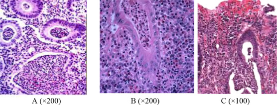 Figure 1. Histopathological grades of ulcerative colitis shows (A) Grade 3, neutrophilic infiltrate in the epithelial cells; (B) Grade 4, crypt destruction; and (C) Grade 5, erosions and ulcers (hematoxylin and eosin stain). |