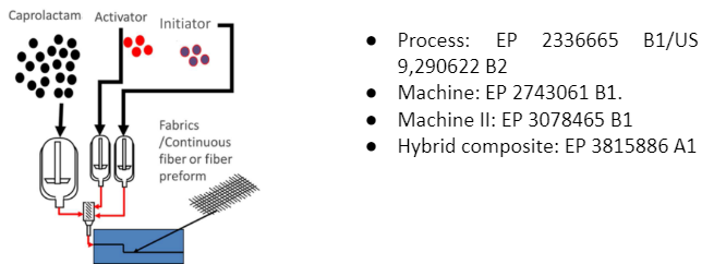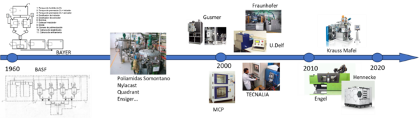 El proceso reactivo de polimerización in-situ de PA6 es conocido desde los años 60 (Bayer, BASF) [3], pero sólo ha sido utilizado de forma industrial para la obtención de semielaborados en diferentes formatos, barras, tubos o planchas, que posteriormente son mecanizados para la obtención de piezas técnicas como rodamientos, poleas o casquillos. En los 2000, algunas empresas químicas, como Brüggemann, empezaron a desarrollar procesos de colada usando la reacción de polimerización aniónica para obtener piezas de geometría más compleja y sólo unos años después, universidades (Universidad de DELF [4]) y centros tecnológicos (Tecnalia [5] y Fraunhofer) comienzan su investigación para utilizar esta reacción en una tecnología de producción de productos finales de poliamida y composites termoplásticos reforzados con fibras de vidrio, carbono y aramida. A partir de 2010-2015, las diferentes líneas de investigación llegan a TRL (Technology Redineess Level) más alto y algunos fabricantes de máquinas desarrollan equipamiento para llevar estas tecnologías a la industria. La figura 2 muestra imágenes de la evolución de las tecnologías y equipamientos de fabricación de poliamida 6 aniónica (APA6) durante los últimos 60 años.