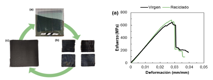 Otra de las ventajas de utilizar la resina Akelite es que permite un reciclado completo del material recuperando la fibra y la resina en óptimas condiciones para la fabricación de una nueva pieza, sumergiendo el material en acetona durante 18 horas. La resina se separa de la acetona mediante un rotavapor por lo que es un proceso 100 % reciclable. Se fabricó una nueva pieza con material 100 % reciclado obteniéndose propiedades mecánicas similares a las del material compuesto virgen (Figura 5).