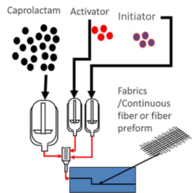 La versatilidad del sistema de APA6 desarrollado dentro de la tecnología Caprocast permite fabricar muchos productos diferentes utilizando diferentes procesos. De esta forma, si queremos obtener piezas másicas, como poleas o engranajes, se utiliza el proceso de colada junto con un mecanizado posterior [8]. Si lo que queremos es obtener productos huecos, se puede utilizar el proceso de rotomoldeo [9]. Para geometrías más complejas se desarrolló el conocido proceso “NyRIM” en el que se inyectaba la mezcla en moldes calefactados para obtenerla pieza [10]. Los composites termoplásticos se pueden obtener de igual forma mediante el proceso de RTM (Resin Tranfer Molding) termoplástico para placas o geometrías tipo cáscara [11] o mediante el proceso de pultrusión termoplástica reactiva para la obtención barras y perfiles [12].