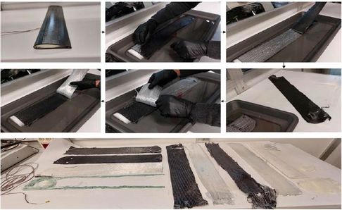 Al finalizar los ensayos, la pala de aerogenerador Akelite se recicló siguiendo el proceso descrito anteriormente, recuperando todos los componentes (fibras, adhesivos, espumas y resina) en 24 horas a temperatura ambiente (Figura 7). El disolvente se separó de la resina disuelta en un rotavapor a 50 °C. Tanto la fibra como la resina se recuperaron en óptimas condiciones pudiéndose reutilizar para la fabricación de una nueva pala eólica.