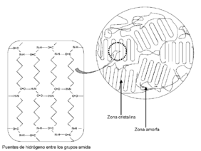 El grado de polimerización obtenido en este tipo de reacciones debe ser suficientemente alto, para que no exista un exceso de caprolactama en el material, ya que éste actuaría sobre la APA6 de la misma forma que lo hace el agua de la humedad ambiental, introduciéndose en la parte amorfa del polímero e impidiendo que se formen puentes de hidrógeno entre los grupos -CO- y -NH-. Estos puentes de hidrógeno son los precursores de la cristalinidad de la APA6, tal y como se muestra en la Figura xx, característica que proporciona las buenas propiedades mecánicas a este polímero [18].