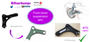 Estos resultados sugieren que la resina Akelite es una alternativa factible para producir materiales compuestos con altas prestaciones similares a las que se obtienen con resinas epoxi, pero con la principal ventaja de que los materiales fabricados con Akelite se pueden termoconformar y reciclar lo cual es imposible con los materiales actuales. El termoconformado se realiza a temperaturas por encima de los 130 °C y una ligera presión, adaptándose a la forma deseada. La Figura 4 muestra un ejemplo de esta característica con el termoconformado de una pieza con ángulos de 90° y tubular a partir de un laminado plano de 4 capas de un tafetán de fibra de carbono. Otra característica de los materiales compuestos con matrices termoplásticas es su capacidad de soldadura de piezas sin la necesidad de utilizar adhesivos.