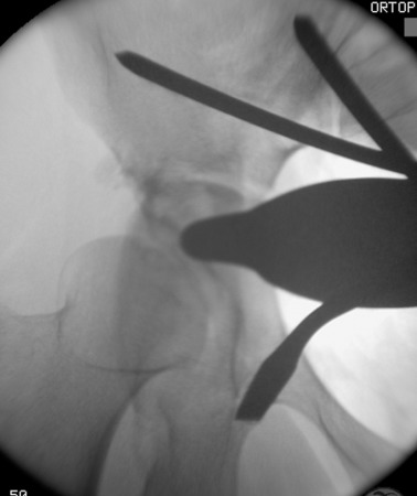 Several osteotomies for the treatment of dysplastic hips have been described in the literature.1 ; 3 ; 4 ; 5 ; 7 ; 8 ; 9 ; 10 ; 11  ;  12 The Ganz periacetabular osteotomy (PAO) involves extensive exposure and careful cutting of the pelvic bones, as well as offers the advantages of a single incision, making higher amounts of corrections and pelvic continuity due to intact posterior colon.12 However, during this process, major complications may develop.1 ; 5 ; 13  ;  14 The most frequently encountered complication during the surgery is penetration of the osteotome into the joint; some authors have reported a 2.7% rate for this complication, which arises as a result of the inability to visualize the quadrilateral surface.15