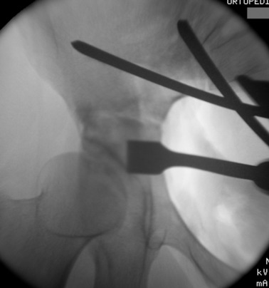 The operation was considered successful if direct visualization and fluoroscopic examination confirmed that the osteotome and screws had not penetrated the joint. At this stage, the applicability of an intrapelvic plate was determined; however, because previous biomechanical studies showed that 2 screws were sufficient for ideal fixation, plate fixation was not performed.21