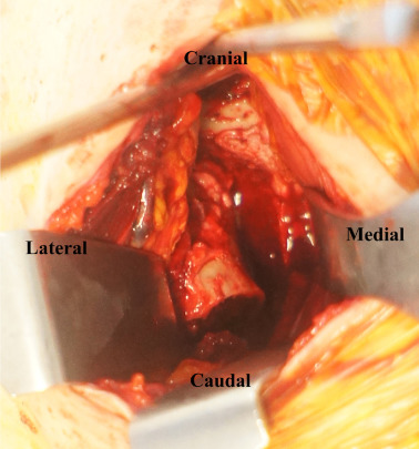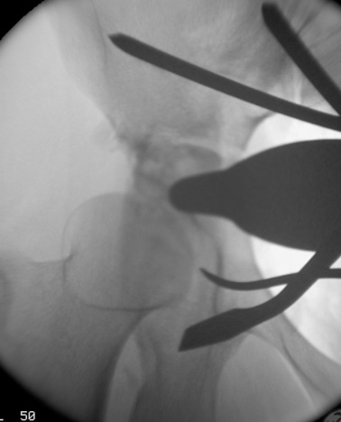 Following the osteotomy procedure, all hips were dissected and dislocated using the direct anterior approach and evaluated to determine whether chisel or screw penetrations had occurred to the joint and surrounding neurovascular structures (Fig. 9 ). Outcome parameters were pre- and postoperative CE angle, distance between the osteotomy and ASIS, and distance between the osteotomy and sciatic notch.