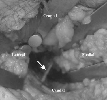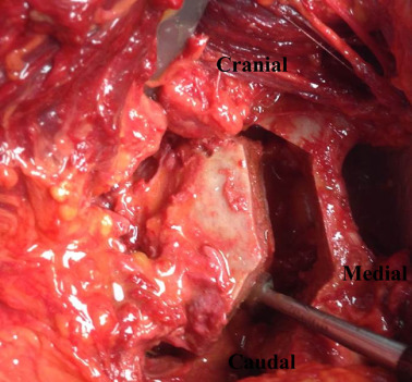 PAO was performed as originally described; however, the exposure involved a modified Stoppa incision. The cadavers were laid supine on a radiolucent operating table, and a 10-cm transverse incision was made 2 cm above the symphysis pubis (Fig. 1 ). The rectus sheath was carefully incised at the inferior border of the rectus abdominis muscle. After incision of the fascia transversalis, the abdominal muscles were bluntly dissected, and the peritoneum was retracted craniomedially with a blunt retractor. The psoas and iliac veins lying on the linea pectinealis were dissected bluntly and retracted carefully. The corona mortis was dissected carefully (Fig. 2 ). The periosteum was raised above the iliopectineal line, and a blunt retractor was inserted into the greater sciatic notch. At this stage, the obturator nerve was visualized in all cases and carefully preserved (Fig. 3 ).