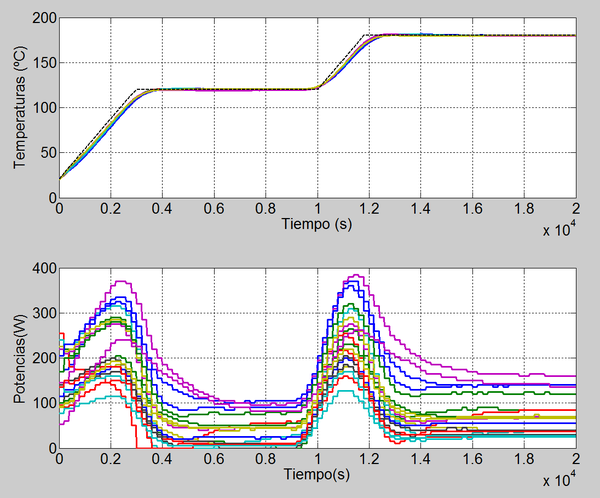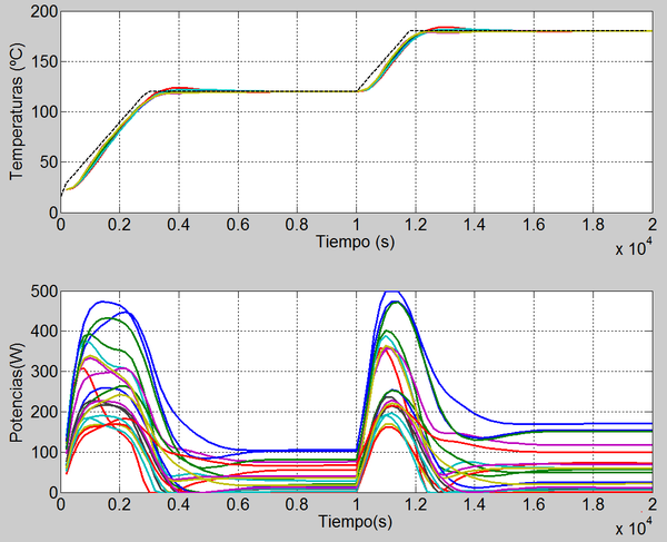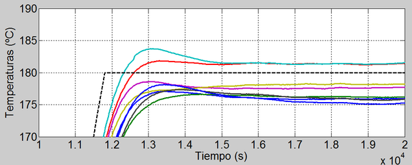 La figura 6 muestra el seguimiento de las temperaturas en los seis puntos de medida al aplicar las potencias a los calefactores demandadas por el controlador MPC. En la figura 7 se muestra un detalle del seguimiento de temperaturas para la consigna de 180ºC.