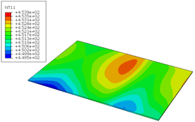 La simulación muestra que el algoritmo es capaz de controlar las temperaturas de los puntos de los que recibe información (sensores de control) con un error máximo en estacionario de 0.02ºC. El error máximo de temperatura en los puntos de la superficie de la cavidad medidos por los termopares provisionales (Figura 2), que no intervienen en el control, es de 5.5 ºC (desde 175.9ºC a 181.4ºC, media en 178.5 ºC), y en el conjunto de nodos de la placa de composite es de 4.4 ºC (desde 176.5ºC a 180.9ºC) según la distribución de temperaturas de la Figura 8.