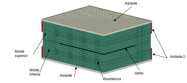 El sistema modelado consiste en un molde de acero cuyas partes superior e inferior están separadas por un anillo de 3 mm de espesor que define la cavidad donde se ubican los tejidos y se inyecta la resina. El molde está recubierto por dos tipos de aislante, un aislante de 6 mm de espesor en las partes inferior y superior y otro aislante de distintas características en el lateral, con 7 mm de espesor.
