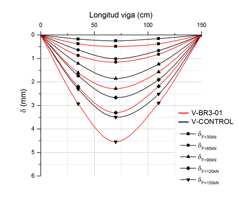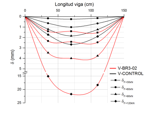 A pesar del aumento significativo de ductilidad en el proceso de fallo, el espécimen V-BR3-02 no fue capaz de alcanzar la carga resistida por la viga sin reforzar. Este comportamiento anómalo se refleja también en la Figura B.28, donde la viga V-BR3-02 registró una deflexión altamente superior a la viga V-CONTROL, desarrollando, para una fuerza aplicada de 120kN, un desplazamiento vertical en la sección de aplicación de la carga un 716% superior al del espécimen sin reforzar. Este hecho indica que la viga V-BR3-02 presentaba una rigidez a flexión deficiente, comparándola con la viga de control y el resto de especímenes ensayados.