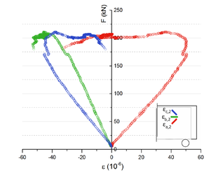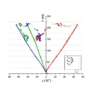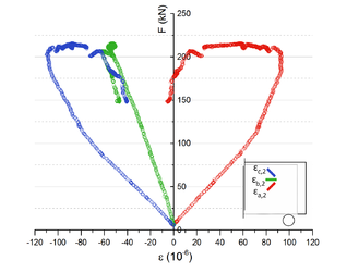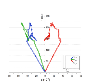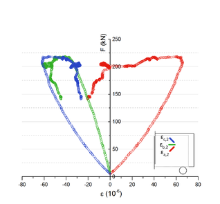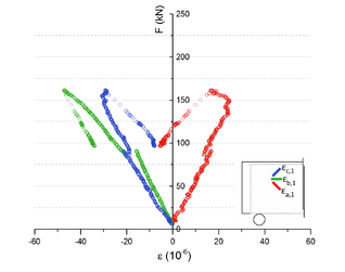 Como se puede observar, ya desde etapas tempranas, las deformaciones de la zona 2 (Figura B.33b) indicaron que el punto estudiado presentaba una distorsión angular superior a la de su homólogo situado en la zona 1 (Figura B.33a). La relación de las deformaciones de las galgas de la zona 2 y la carga aplicada fue lineal hasta alcanzar el la carga máxima resistida. No fue así para las lecturas registradas por las galgas de la zona 1, donde el comportamiento lineal se mantuvo hasta una carga de 140kN a partir de la cual, se desarrolló un acusado comportamiento no lineal. Como en la mayoría de casos, las galgas εa,i registraron deformaciones asociadas a tracciones y las galgas εb,i y εc,i deformaciones asociadas a tensiones de compresión.