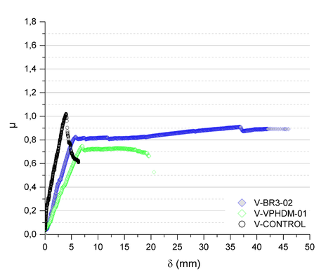 En la Figura B.23 se muestra la relación entre la fuerza aplicada y el desplazamiento vertical en la sección de aplicación de la carga del espécimen reforzado con tejidos de fibras de basalto V-BR3-01 y la viga sin reforzar V-CONTROL. En ella se puede observar como la viga reforzada desarrolló un comportamiento elástico-lineal hasta alcanzar la carga máxima (Tabla B.3), coincidiendo la propagación de la fisura diagonal principal. A partir de este instante, después de experimentar un leve descenso de la capacidad resistente, el espécimen logró mantener la carga resistida constante hasta el colapso definitivo, aumentando significativamente la ductilidad respecto el comportamiento desarrollado por la viga sin reforzar.