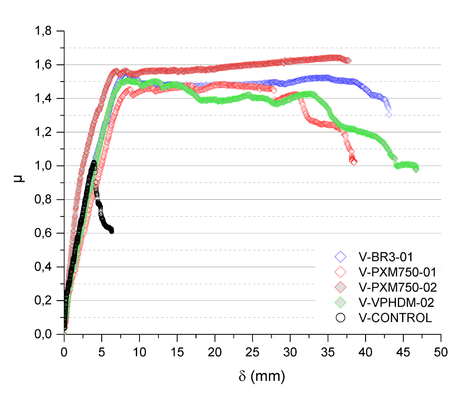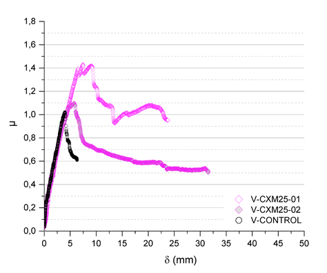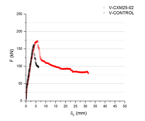 Comparando los comportamientos de ambos especímenes se puede observar como, a pesar de no desarrollar un fallo con un grado superior de ductilidad, la viga V-CXM25-01 fue capaz de incrementar la capacidad de carga de la viga sin reforzar en un 36%.