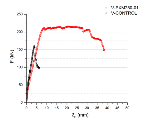 En la Figura B.39 se muestra la relación entre la fuerza aplicada y el desplazamiento vertical en la sección de aplicación de la carga del espécimen reforzado con tejidos de fibras de PBO (V-PXM750-01) y de la viga sin reforzar V-CONTROL. En ella se puede observar como la viga reforzada desarrolló un comportamiento lineal hasta alcanzar la carga en la que se empezó a propagar la fisura diagonal principal. A partir de este instante, el espécimen logró incrementar de forma no lineal su capacidad de carga. Este proceso se prolongó hasta alcanzar la fuerza máxima resistida, con un desplazamiento vertical de la sección sometida a carga un 422% superior al de la viga de control.