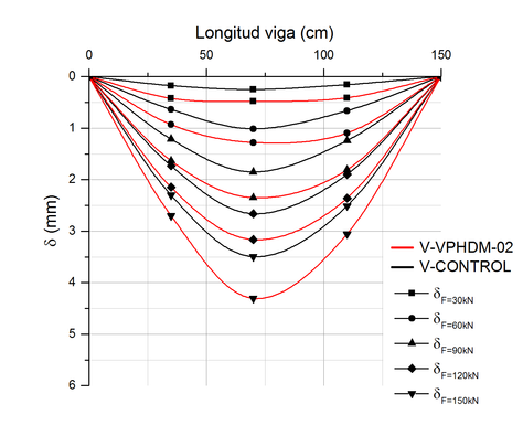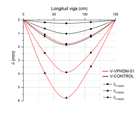 Además de no alcanzar la carga última del espécimen sin reforzar, la viga V-VPHDM-01 presentó un claro déficit de rigidez a flexión, tal y como se puede observar comparando los tramos elástico-lineales de las curvas de carga-deformación vertical de la sección donde se aplicó la carga (Figura B.47) y las deformadas de ambas vigas (Figura B.48).