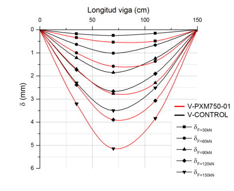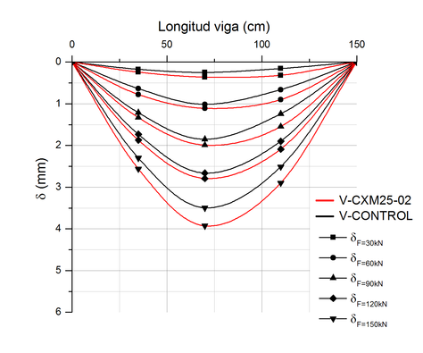 El comportamiento mecánico de la viga V-CXM25-02 resultó muy similar a su homóloga sin reforzar, con la diferencia que el espécimen reforzado con tejidos de fibras de carbono logró resistir 7,2% más de carga que la viga V-CONTROL (Figura B.35). Por otro lado, el espécimen sin reforzar desarrolló una rigidez a flexión superior, tal y como se muestra en los tramos lineales de las curvas de carga respecto el desplazamiento vertical de la sección donde se aplicó la fuerza (Figura B.35) y en la comparación de las deflexiones de ambas vigas (Figura B.36).