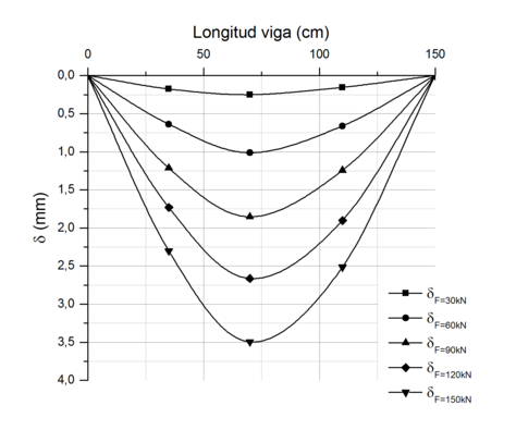 La Figura B.20 muestra la deformada de la viga para diferentes valores de carga. Teniendo en cuenta las particularidades de la configuración del ensayo, se puede observar un comportamiento aproximadamente simétrico de la deformada del espécimen, coherente con lo establecido anteriormente.
