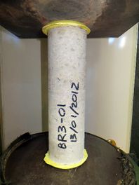 La viga V-BR3-01 fue uno de los especímenes reforzados con TRM utilizando tejidos de fibras de basalto. La Tabla B.3 resume los resultados obtenidos en el ensayo realizado en fecha 09/10/2012. Este espécimen desarrolló un elevado grado de ductilidad previo al colapso. La fisura principal se propagó diagonalmente desde la sección donde se aplicó la carga, travesando la zona central con armadura transversal y no invadiendo relevantemente la zona reforzada con TRM (Figura B.22). De idéntica forma a la viga V-CONTROL, este espécimen rompió por la zona donde el tramo a cortante es mayor (zona 2).