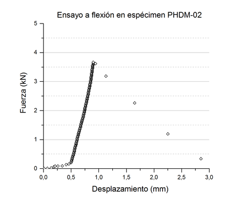 La segunda muestra de viga de hormigón armado reforzada a cortante con TRM compuesto por tejidos de fibras de vidrio fue la V-VPHDM-02. La Tabla B.10 resume los resultados obtenidos en el ensayo realizado en fecha 21/09/2012.