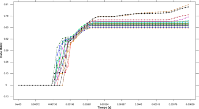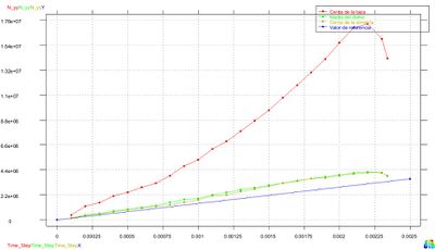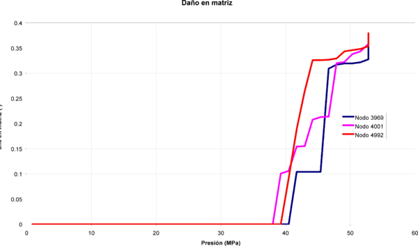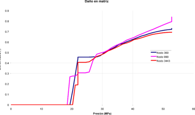 Las siguientes figuras muestran la evolución del daño respecto de la presión (figura 49) y del tiempo (figura 50) en los tres nodos del anillo central de la figura 4. Se puede observar que aparece daño cerca de la presión nominal (alrededor de los 19 MPa) de una forma brusca y luego, a medida que se incrementa la presión, el daño se incrementa con una pendiente menor.
