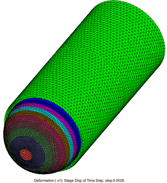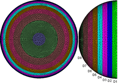Este modelo tiene la geometría del depósito completo (domo semiesférico + cilindro) con una simetría transversal en la sección situada en la mitad de su longitud. Cilindro y domo se consideran solidariamente unidos. La tapa tiene un espesor diez veces mayor que el resto del domo.