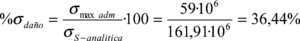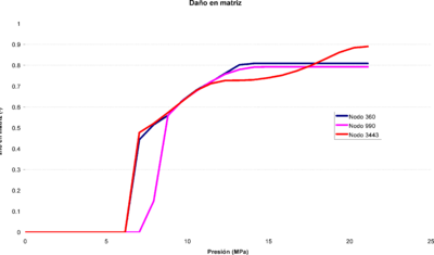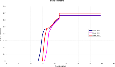Para la predicción del daño en la matriz se compara la tensión de servicio en la matriz calculada analíticamente en [3] en el estado de servicio con el valor máximo que soporta la matriz (59MPa).