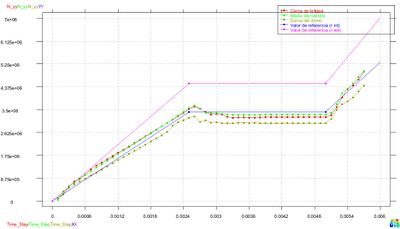 En las figuras 51 a 58 se describen los esfuerzos de sección Nxx y Nyy para domo y cilindro referidas o a presión o a tiempo de simulación. Los valores de Nyy y Nxx simulados se asemejan de forma importante en el caso de la parte del cilindro. Recordar que en el caso del domo, el Nxx simulado queda por debajo del analítico y el Nyy por encima debido a que el valor de referencia no tiene en cuenta las orientaciones de fibra y, en el caso de una semiesfera, alcanza valores teóricos exactamente iguales para Nxx y Nyy.