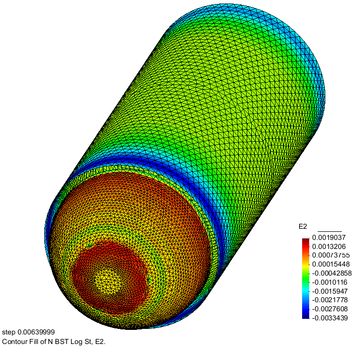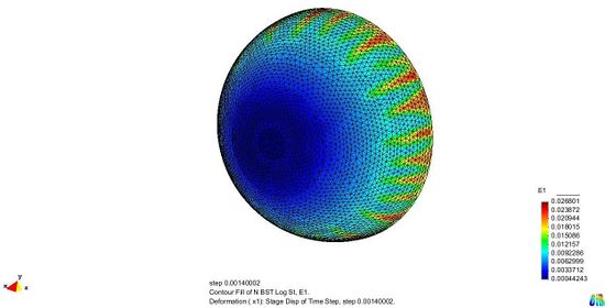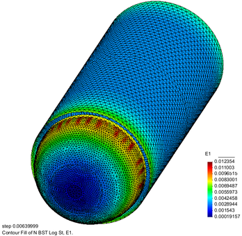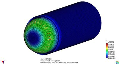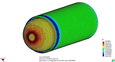 A continuación se muestran las deformaciones principales a lo largo de toda la geometría (figuras 7 y 8). Como a la tapa fictícia se ha dado un espesor diez veces mayor, la deformación es mínima en esta zona.