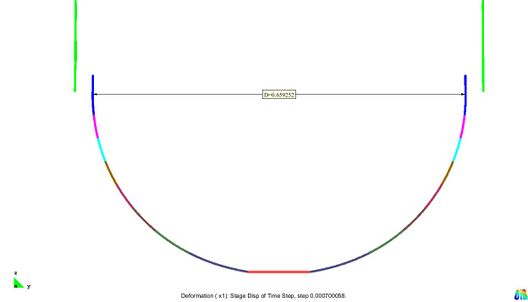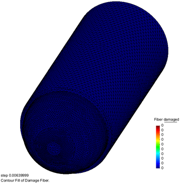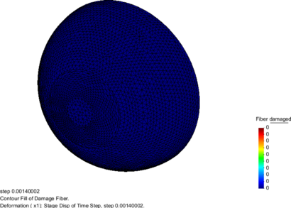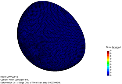 Tal y como se observa en la figura de daño en fibras (fig. 6), para este instante de tiempo el valor de daño es zero en todo el domo, lo que significa que no han empezado a dañarse. Cuando el valor de daño es 1 significa que está completamente dañado en toda su sección.