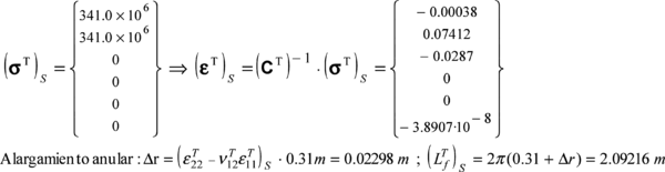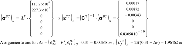 Al igual que en el apartado anterior, aquí se estudia el estado de tensión en los materiales componentes del domo que están en contacto con el cilindro. El estado de deformación se obtiene a partir de las tensiones calculadas membranalmente (3.2 en [3]) y del tensor constitutivo del material compuesto para el cilindro (ver Anexo 4.3 en [3]).