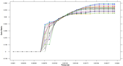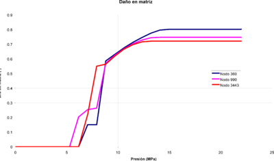 A continuación se puede ver como evoluciona el daño en la matriz en los puntos representativos indicados en la figura 4. La evolución del daño se ha realizado en función de la presión del cilindro (fig. 10) y también a lo largo del tiempo (fig. 11) en que se ha aplicado en la simulación, descrito en la figura 3.