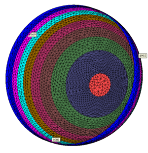En este apartado se muestran los resultados obtenidos por simulación para una propuesta de distribución de espesor y dirección de fibras variable en el domo calculada a partir de los criterios propuestos por ACCIONA en la referencia [4]. En las tablas 3 y 4 se muestran los ángulos de apilado y espesores aplicados en cada uno de los anillos indicados en la figura 4. Estos apilados y espesores están informados sobre el plano medio de la geometría correspondiente a los espesores 36,2 y 99,2 mm (ver figura 2), por lo que se asume provisionalmente un error mayor que en los casos de espesor constante en el domo.