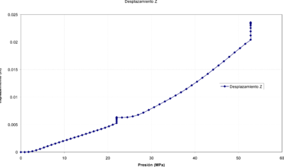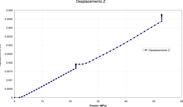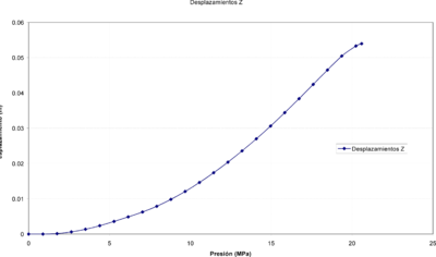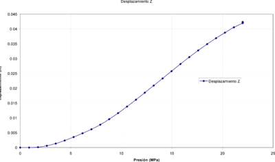 En la siguiente figura aparece el desplazamiento que se produce en la tapa en el eje longitudinal del depósito. Los valores son también función de la presión. Se puede observar que los valores son positivos, cosa que indica que en este caso la tapa también se desplaza hacia dentro del depósito.
