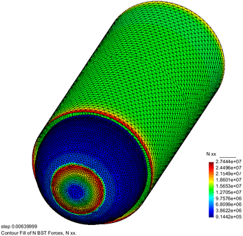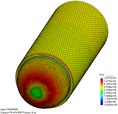 Las figuras 67 y 68 muestran la distribución de los esfuerzos de sección en las direcciones principales Nyy y Nxx. En el caso de los Nxx, los valores son positivos a lo largo de todo el modelo. En lo que se refiere a Nyy, los valores son positivos excepto en el domo, justo en la parte de unión con el cilindro.