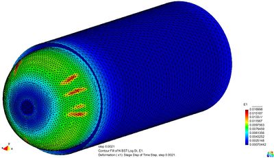 En este informe se muestran distintas simulaciones realizadas sobre dos tipos de modelos: sólo el domo (caso A) y el conjunto domo y cilindro (caso B). Se pretenden determinar los niveles de presión interior a partir de los cuales aparece daño en la matriz y/o fibra en cada caso. Se evalúa no solo su localización inicial sino también su evolución al aplicar presión interior de forma progresiva hasta el valor nominal (22 MPa) y hasta una sobrecarga de 2,4 veces la presión nominal (52,8 MPa).
