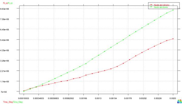 Las figuras que siguen describen los esfuerzos de sección en las dos direcciones principales Nxx y Nyy en los mismos 3 puntos de la anterior simulación. En las figuras 24 y 26 se refieren a la presión interior a la que está sometido el domo. En las figuras 25 y 27 se refieren al tiempo de simulación a la que se encuentra el domo (la correspondencia entre tiempo de simulación y presión se encuentra en la figura 3).
