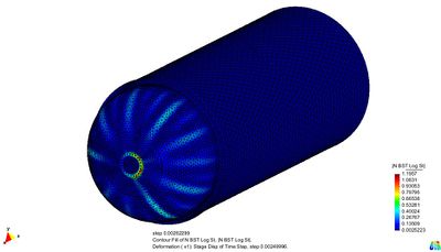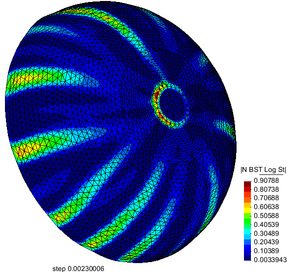 En la siguiente figura se puede ver la deformada de los elementos BST (elementos shell o de lámina que se han empleado en las distintas simulaciones) para una presión muy próxima a la nominal (92%).