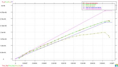 En las figuras 36 a 43 se describen los esfuerzos de sección Nxx y Nyy para domo y cilindro. En todos los casos, los esfuerzos se refieren a presión y a tiempo de simulación. Tal y como se ha comentado anteriormente, en el caso analítico de referencia existe un solo Nii que se compara con los Nyy y a Nxx simulados. Los valores, al igual que en todas las simulaciones, se han obtenido en 3 puntos que siguen una línea meridional en el domo y en el cilindro.